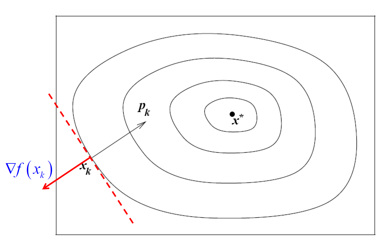 • 线搜索策略(line search)中,算法首先选择一个搜索方向 pkp_k,然后从当前迭代点 xkx_k 出发,沿该方向寻找一个函数值更低的新迭代点。